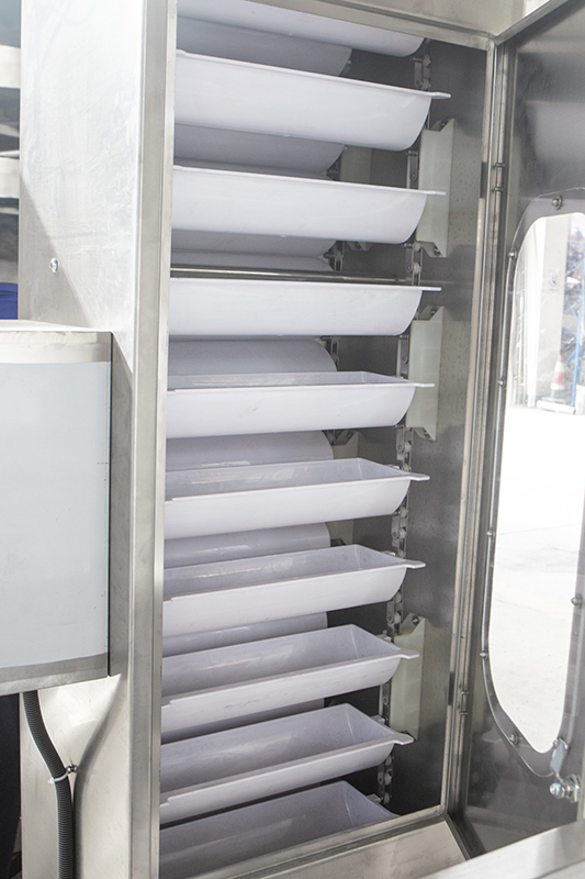 結構、工作原理及使用特點:本機由烘箱、振動底座、自動上料機構、抽濕裝置、冷卻裝置、連接風管、蒸汽換熱器、風機等組成。當蒸汽進入換熱器后進行熱交換,產(chǎn)生高溫干燥熱空氣通過強力風機的作用,由下而上進入烘箱,同時物料在自動吸料機構的作業(yè)下自頂部進入烘箱,熱空氣與物料在烘箱內進行逆流交換,物料在振動電機的作用下沿阿基米德螺旋線翻滾走動,并與熱風充分接觸,從而達到干燥效果。烘箱上部連接吸濕裝置,及時排除烘焙時產(chǎn)生的濕氣。烘箱內裝有網(wǎng)板,以滿足不同大小的物料烘干要求。全自動振動烘干設備最大特點是能源能充分利用、工作連續(xù)性好、物料干燥均勻、生產(chǎn)量大、操作方便、衛(wèi)生條件好、易清洗、易維護、適用范圍廣。整機均由全不銹鋼制作,符合GMP要求。本機適用于烘干帶濕潤水的物料,不適合烘干含有結合水的物料。